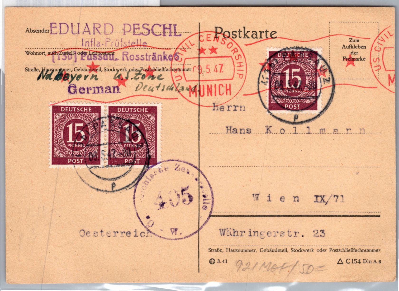 15 Pfennig im waagerechten Paar und einzeln als Mehrfachfrankatur portogerecht am 6.5.1947 auf Auslandspostkarte mit amerikanischer und österreichischer Zensur von Passau nach Wien gelaufen.