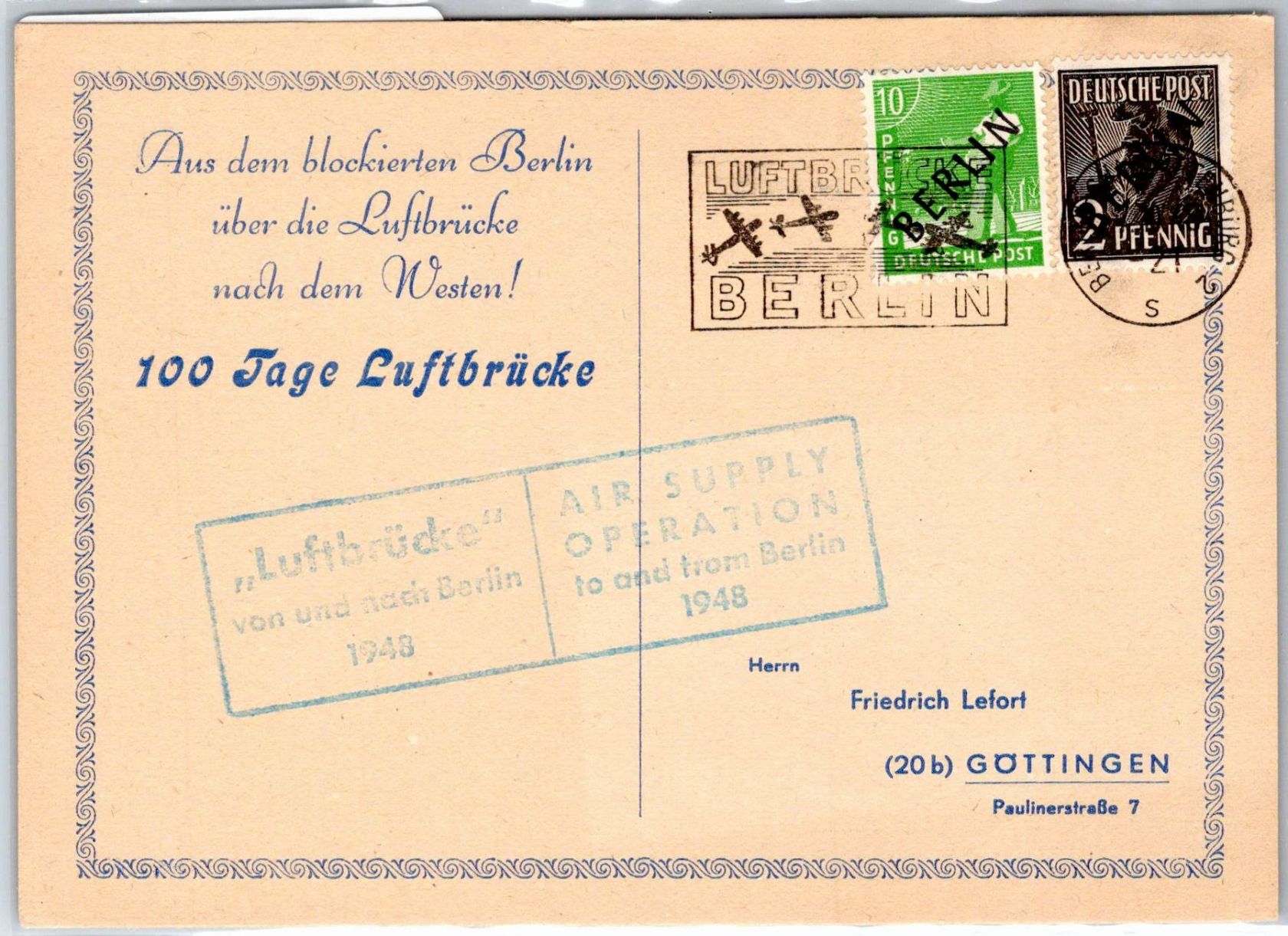 2+10 Pfennig Schwarzaufdruck als Mischfrankatur auf Sonderpostkarte mit seltenem Luftbrückenstempel