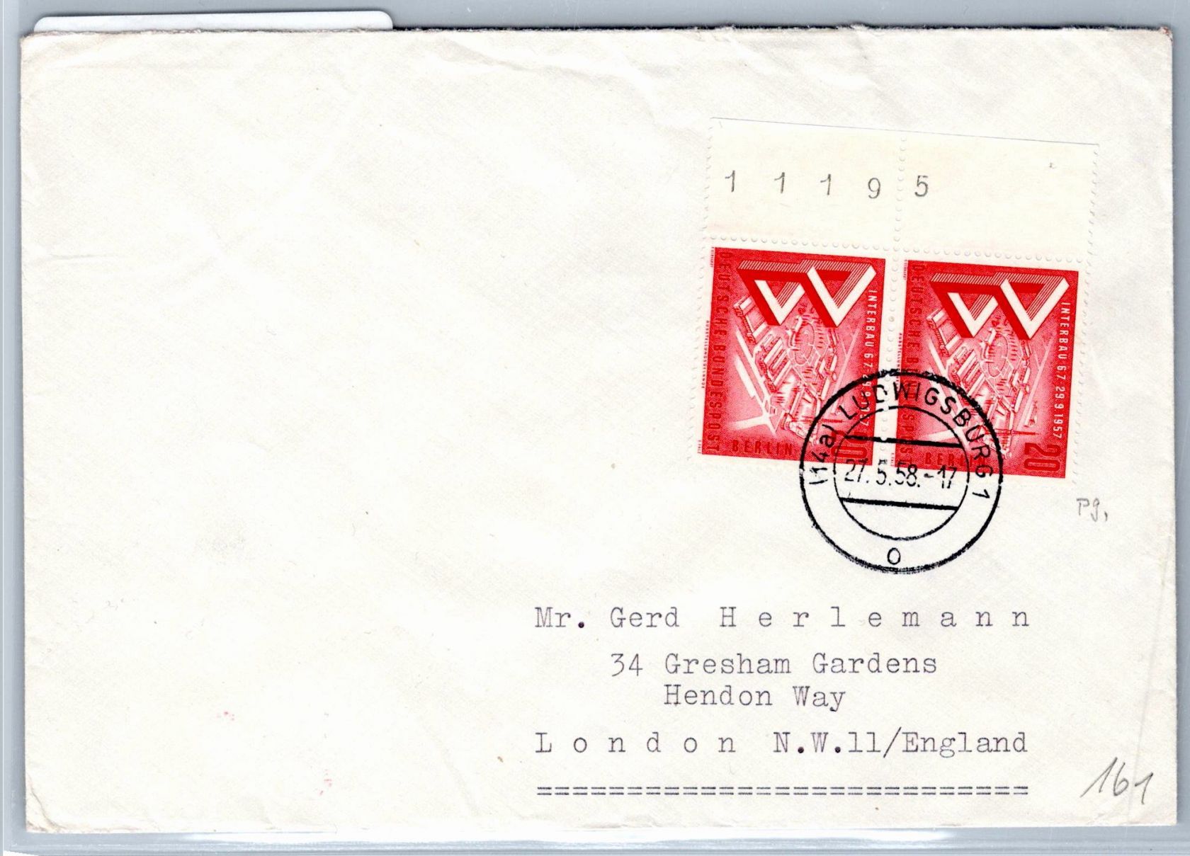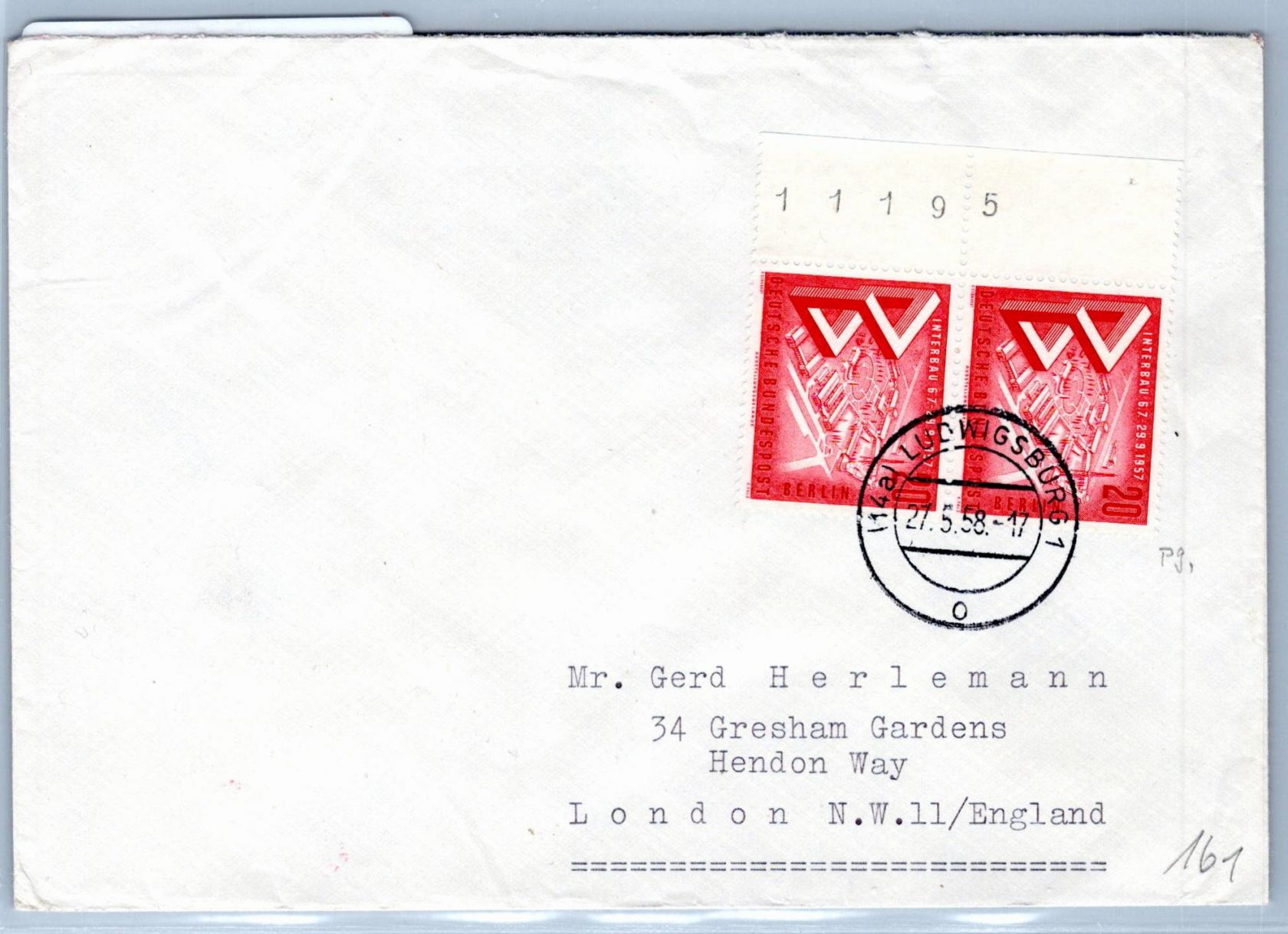 20 Pfennig Interbau im waagerechten Paar vom Seitenrand auf Auslandsbrief als Mehrfachfrankatur portogerecht am 27.5.1958 von Ludwigsburg nach England gelaufen.