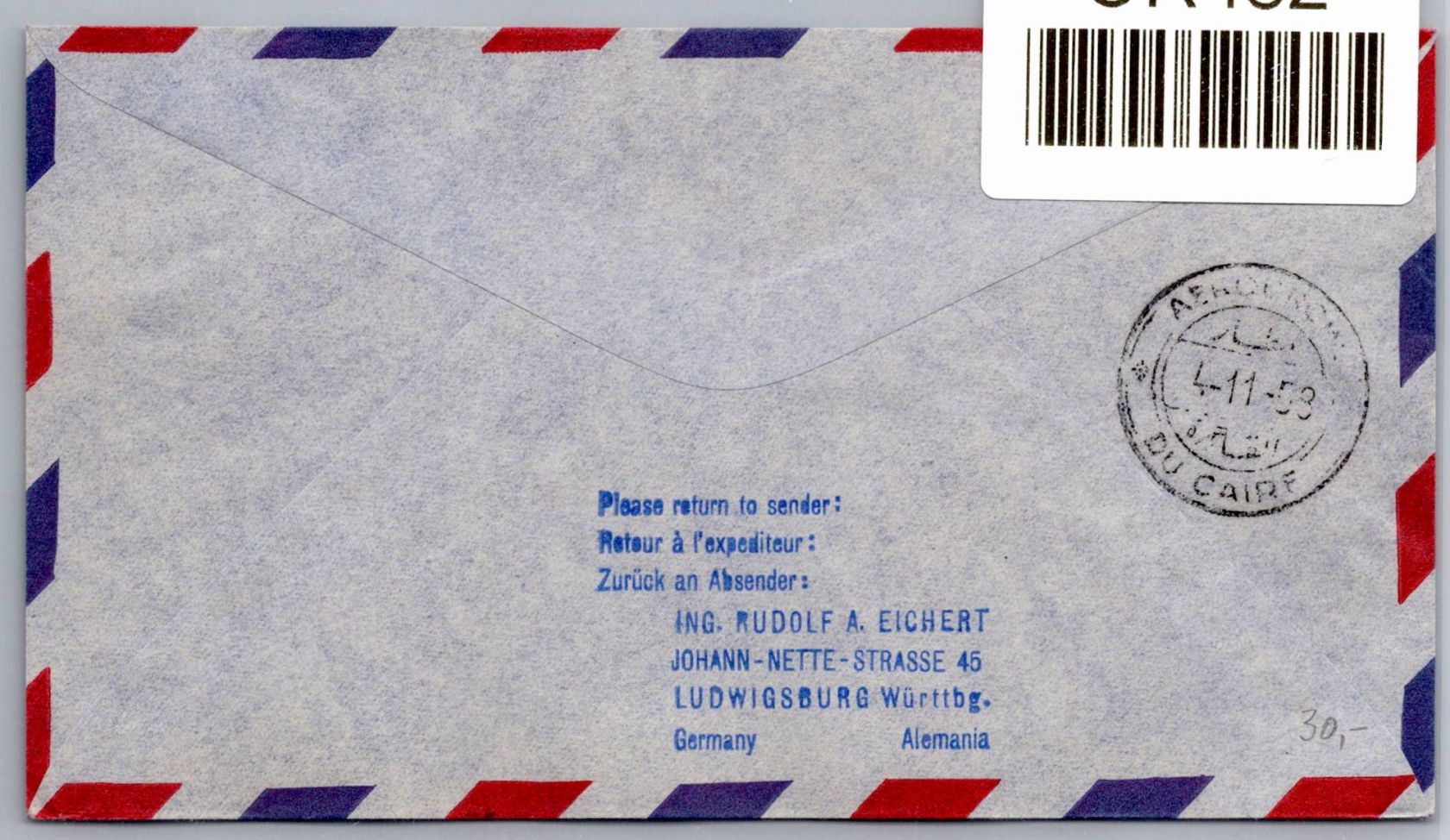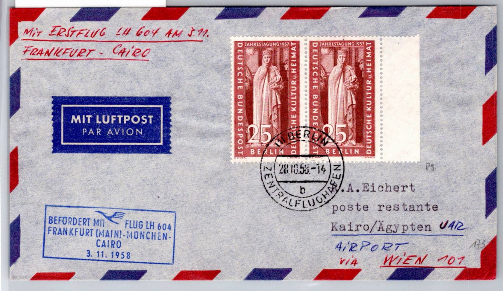 25 Pfennig Ostdeutscher Kulturrat im Waagerechten Paar auf Luftpostbrief Ausland als Mehrfachfrankatur portogerecht am 28.10.1958 von Bad Berlin nach Kairo in Ägypten gelaufen.