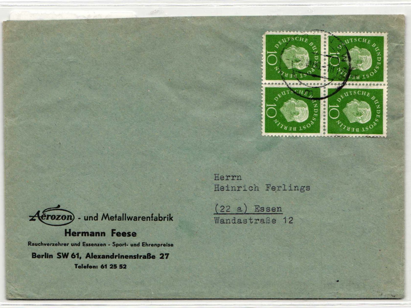 10 Pfennig Heuss Bogenpaar im 4er-Block als portogerechte Mehrfachfrankatur auf Brief 2. Stufe von Berlin am 2.11.1960 nach Essen gelaufen.