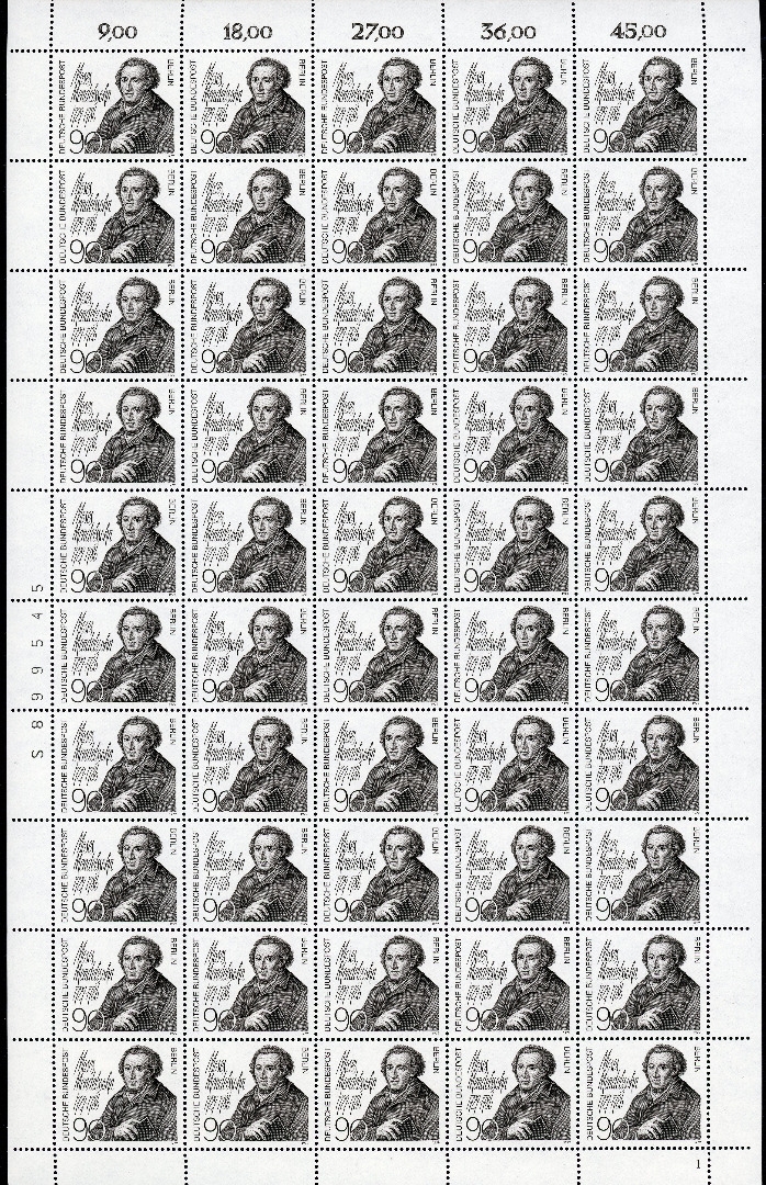 Kompletter Bogen, ungefaltet und nicht angetrennt. Die Abbildung ist exemplarisch!