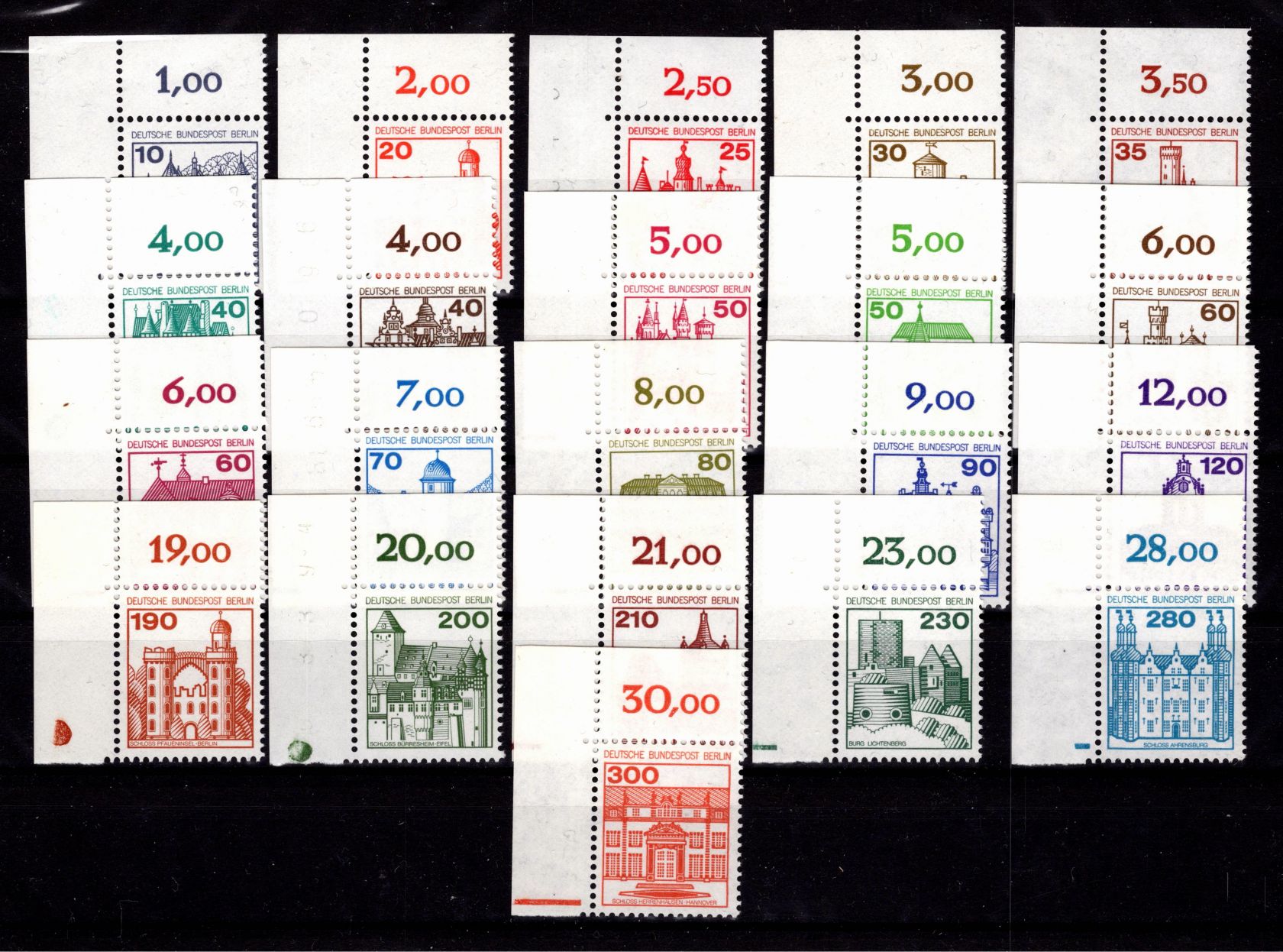 Burgen und Schlösser Ecke oben links (bis auf 60 Pfennig) jeweils mit Randzudruck.
