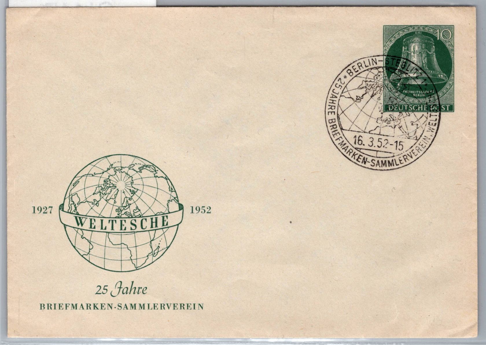 10 Pfennig Glocke links auf Privatumschlag Privatganzsache ungelaufen mit Sonderstempel Berlin Steglitz vom 16.3.1952