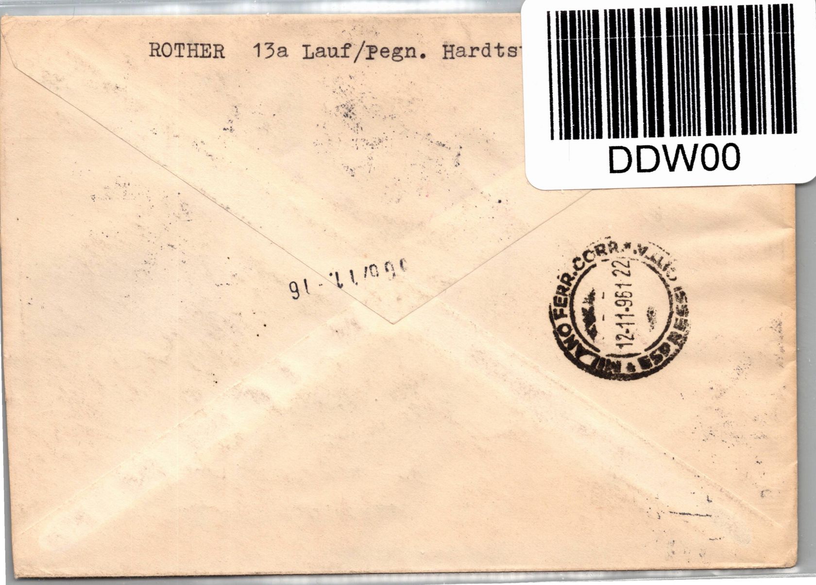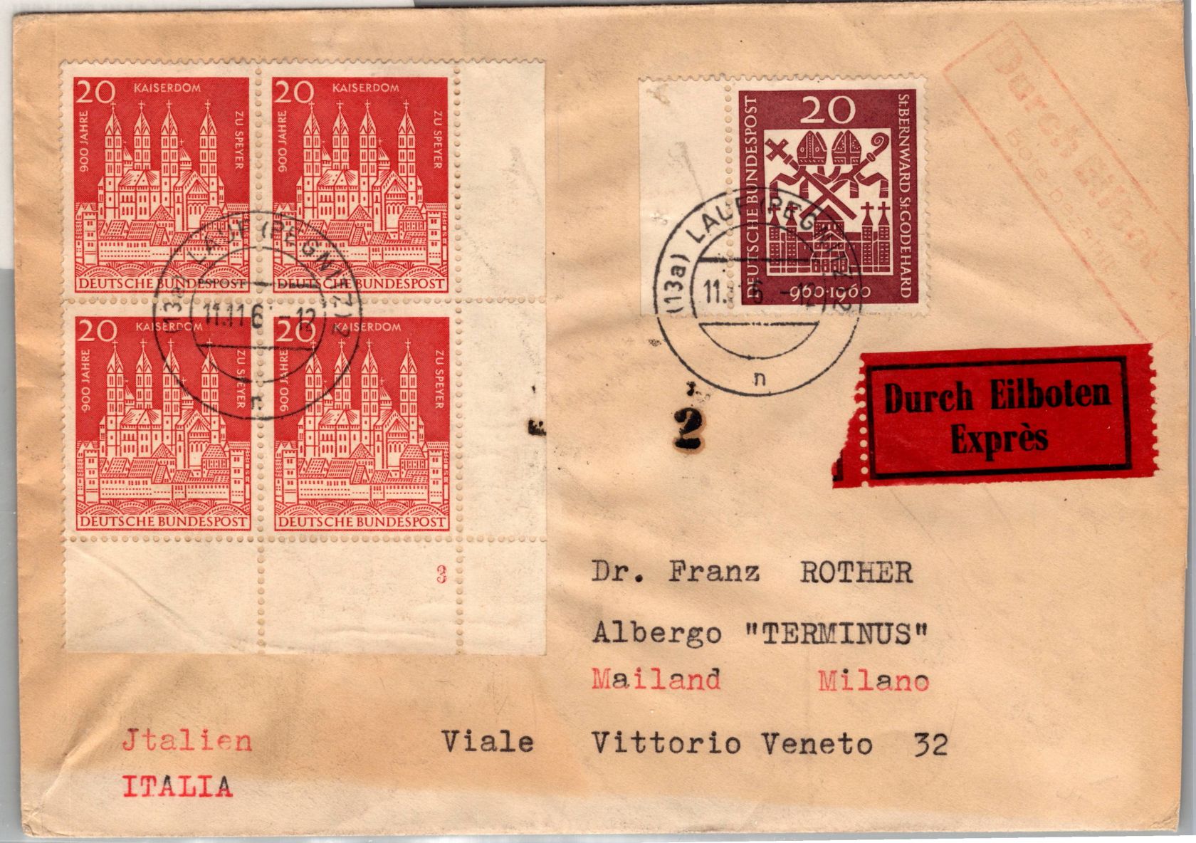 20 Pfennig Bischöfe und 20 Pfennig Kaiserdom Speyer im Viererblock aus der unteren rechten Ecke mit Formnummer 3 als Mischfrankatur auf Auslandsbrief Eilboten Express portogerecht am 11.11.1961 von Lauf an der Pegnitz nach Mailand Italien gelaufen.