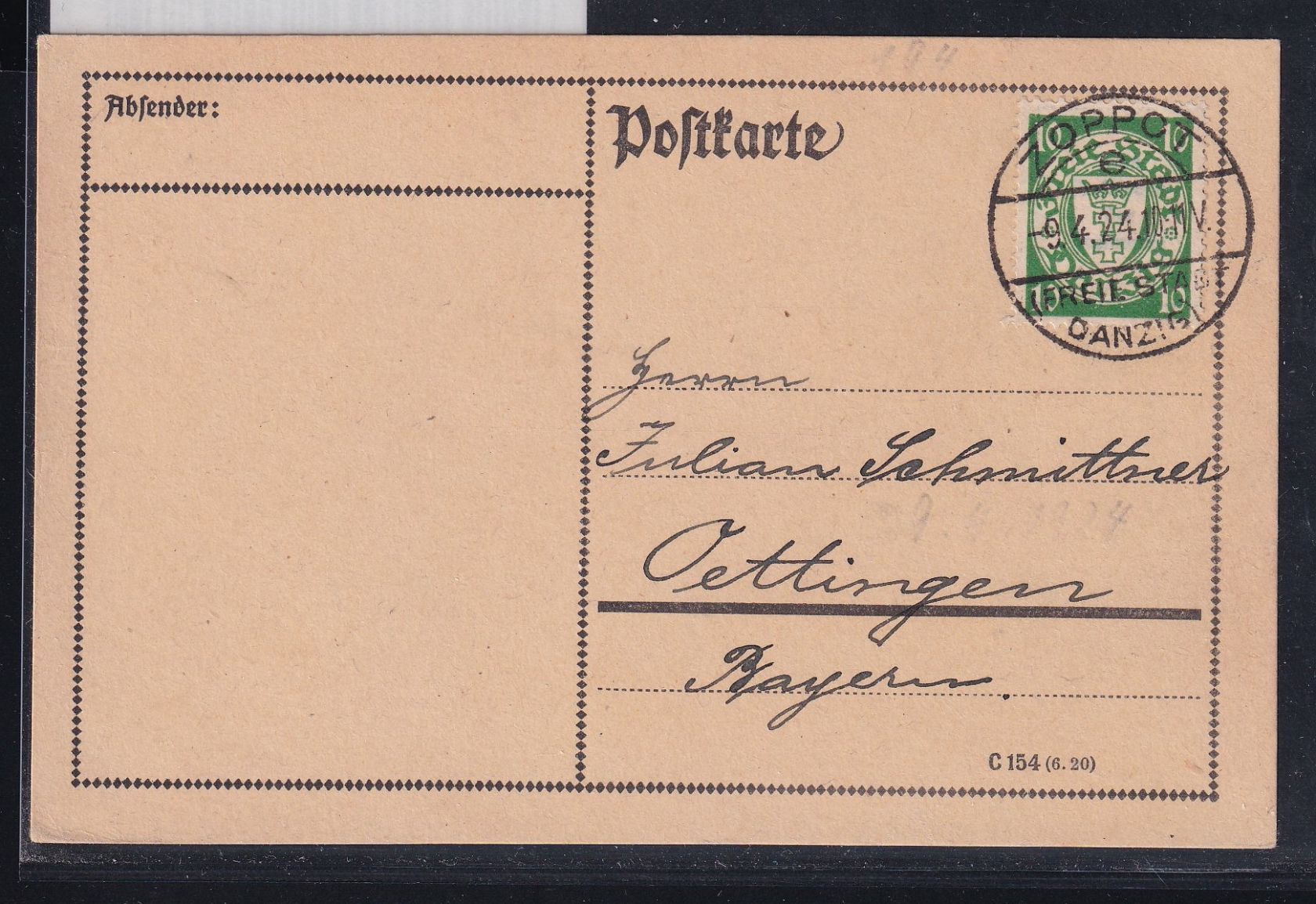 10 Pfennig Freimarken Staatswappen im Oval auf Postkarte portogerecht am 9.4.1924 von Zoppot nach Oettingen gelaufen.