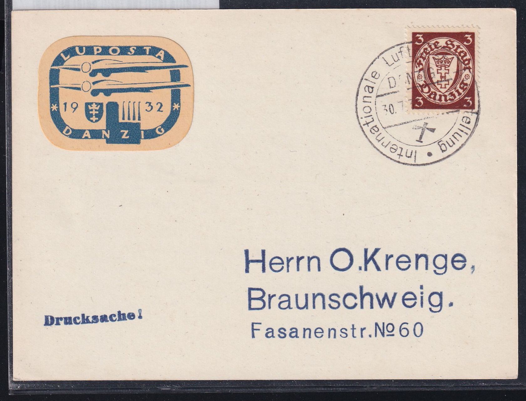 3 Pfennig Freimarken Staatswappen im Oval auf Postkarte Drucksache portogerecht am 30.7.1932 mit Sonderstempel Luposta von Danzig nach Braunschweig gelaufen.