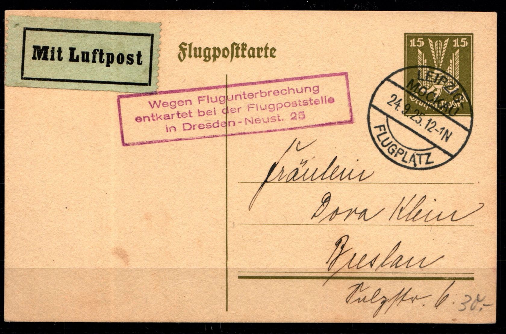Ganzsache P155 mit Sonderstempel Leipzig-Mockau Flugplatz gestempelt am 24.9.25, mit rotem Zusatzstempel "Flugunterbrechung".