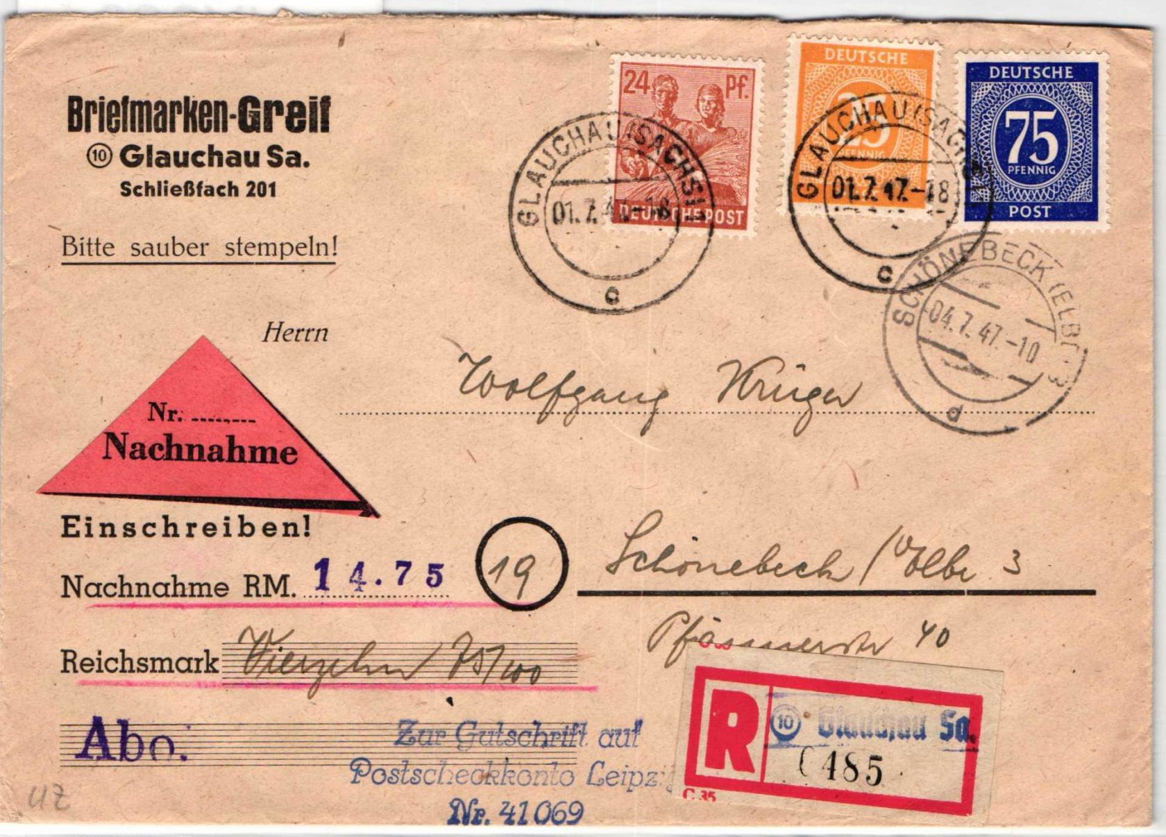 25 Pf.+75 Pf. Ziffer und 24 Pf. Arbeiter am 1.7.1948 auf Einschreiben Nachnahme Fernbrief portogerecht von Glauchau nach Schönebeck gelaufen.