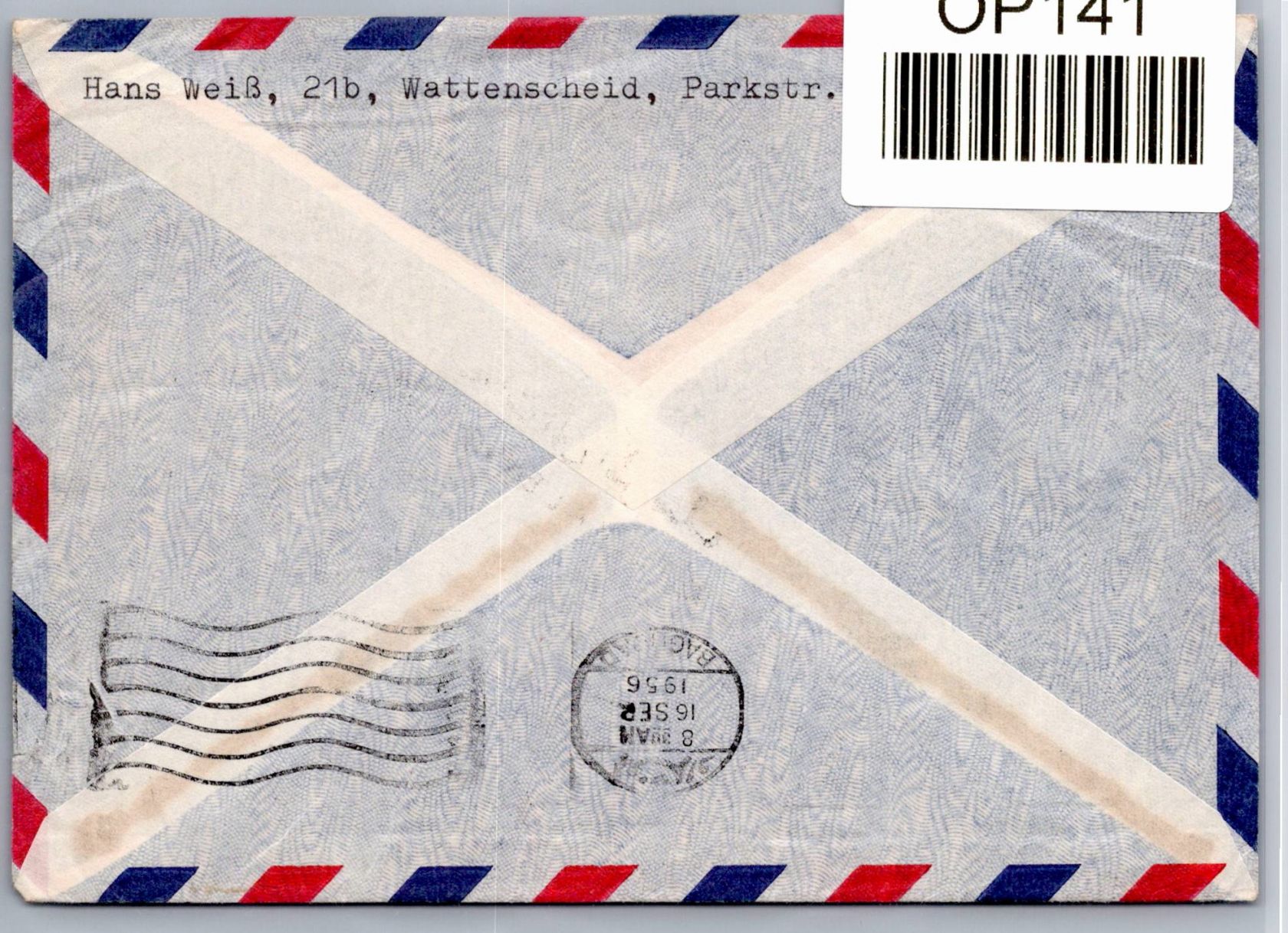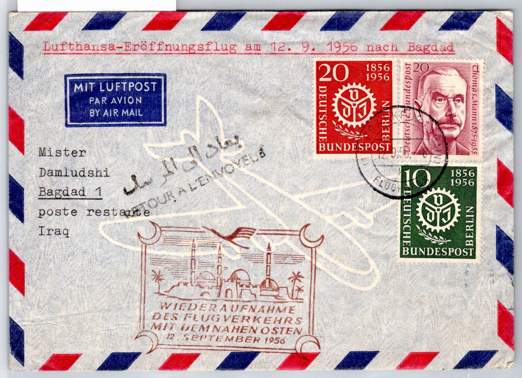 10+20 Pfennig Verein Deutscher Ingenieure mit Zusatzfrankatur auf Erstflugbeleg Lufthansa Aufnahme Flugverkehr Naher Osten von Frankfurt nach Bagdad am 12.9.1956.