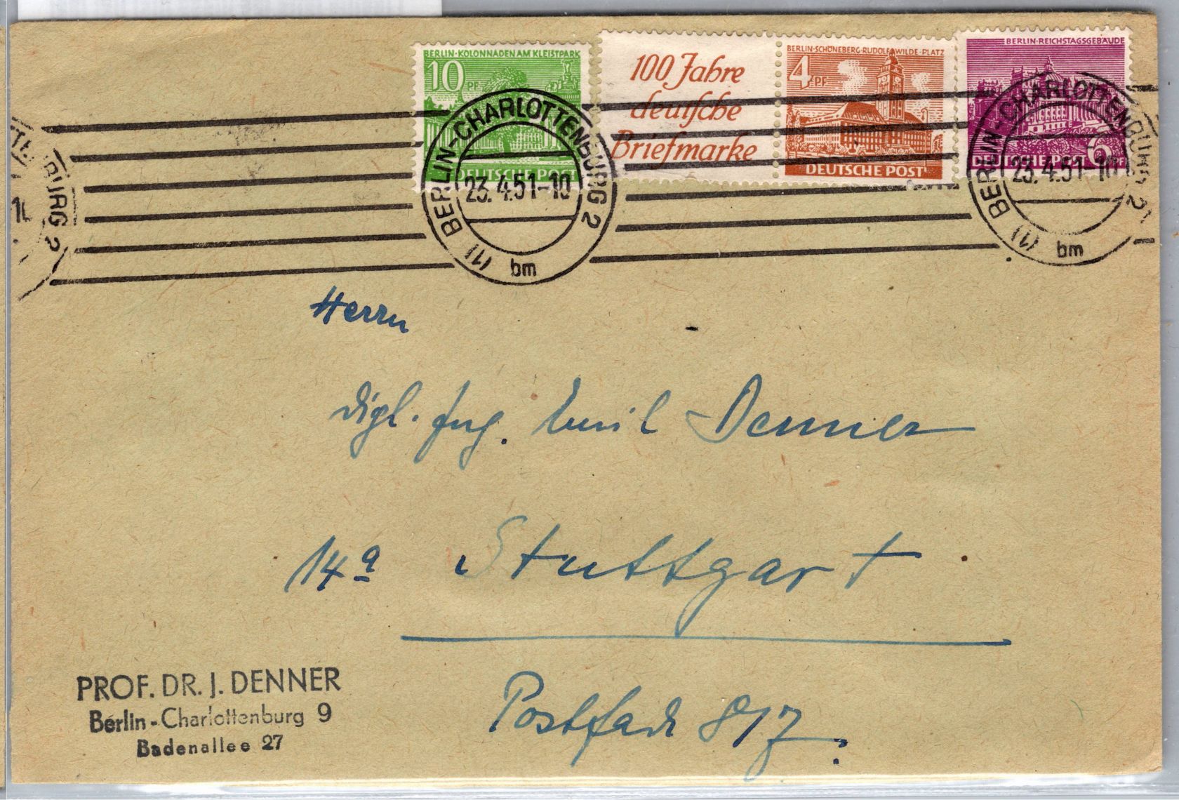 Waagerechter Zusammendruck R 1c + 4 Pf. mit 6+10 Pfennig Bauten als portogerechte Mischfrankatur am 23.4.1951 von Berlin Charlottenburg nach Stuttgart gelaufen.