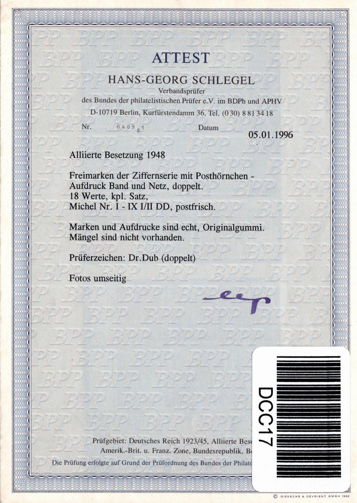 Bi-Zone I/I DD-IX/I DD, I/II DD-IX/II DD postfrisch Fotoattest Schlegel #DCC17