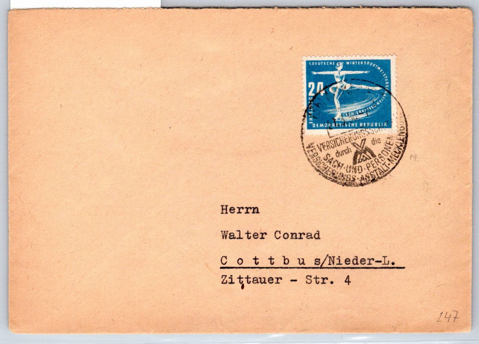 24 Pfennig "Wintersportmeisterschaften" als portogerechte Einzelfrankatur auf Fernbrief von Anklam am 21.03.50 nach Cottbus gelaufen .
