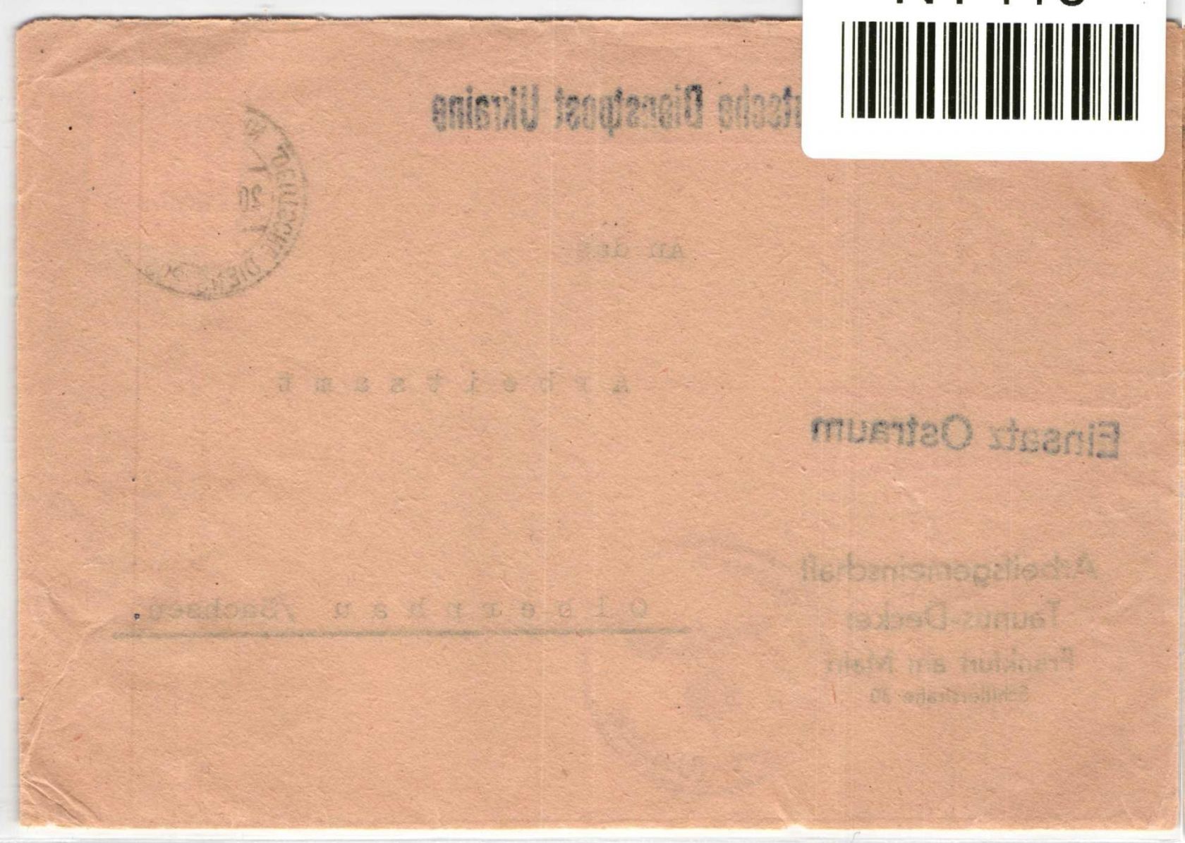 12 Pfennig Freimarke auf Briefvorderseite Deutsche Dienstpost Ukraine am 20.7.1942 von Frankfurt nach Olbernhau gelaufen.