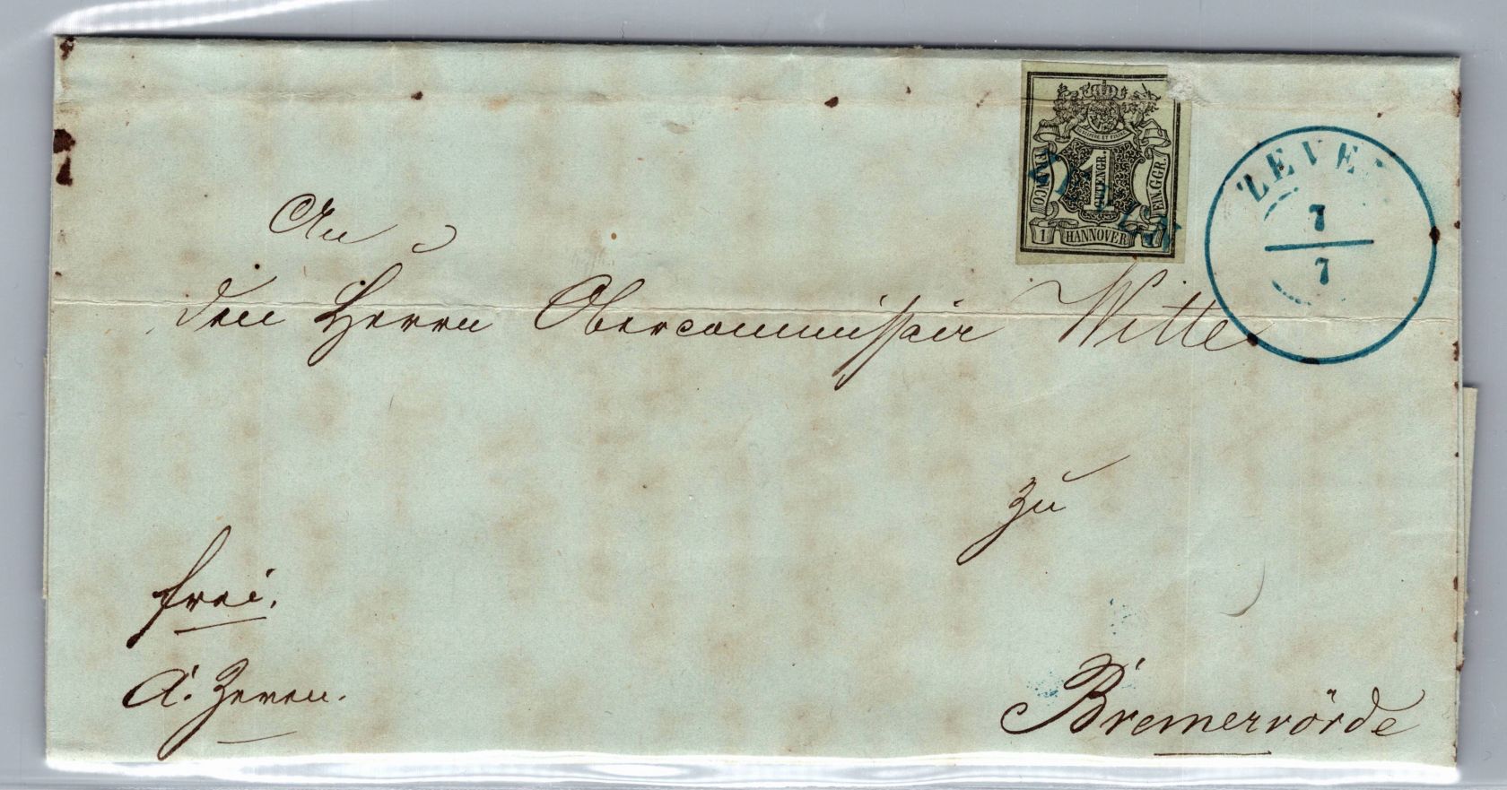 1 Ggr. "Wertschild im Wappen" auf Brief von Zeven nach Bremervörde gelaufen. Marke beschädigt