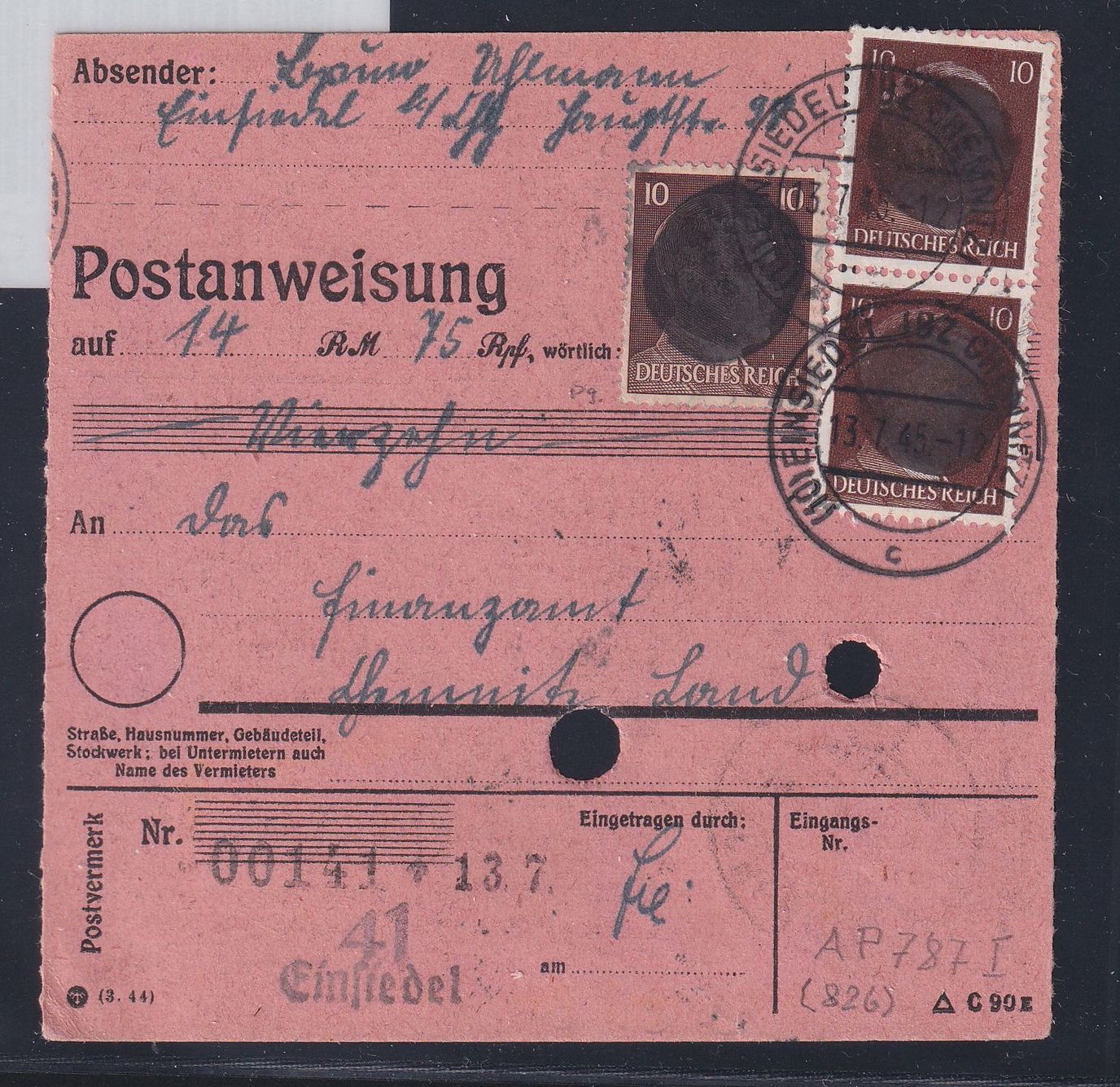 10 Pfenning "Freimarken" dunkelsiena und schwarzrotbraun per 2 RPD Chemnitz als Mischfrankatur auf Postanweisung über 14,75 RM portogerecht am 13.7.1945 von Einsiedel nach Chemnitz gelaufen.