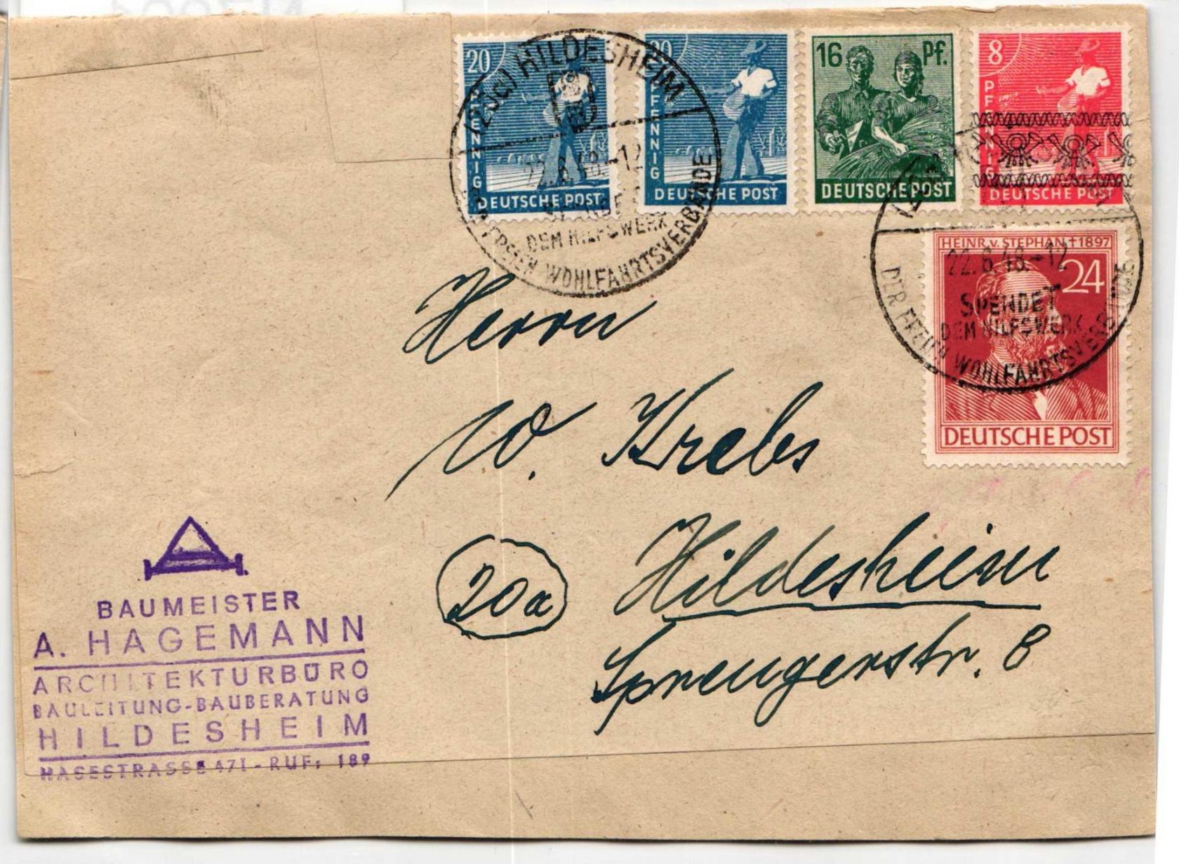 16,20 Pf. Arbeiter und 24 Pf. Stephan in Kombination mit 8 Pf. Arbeiter Bandaufdruck als Mischfrankatur Ortsbrief Zehnfachfrankatur portogerecht am 22.6.1948 in Hildesheim gelaufen.