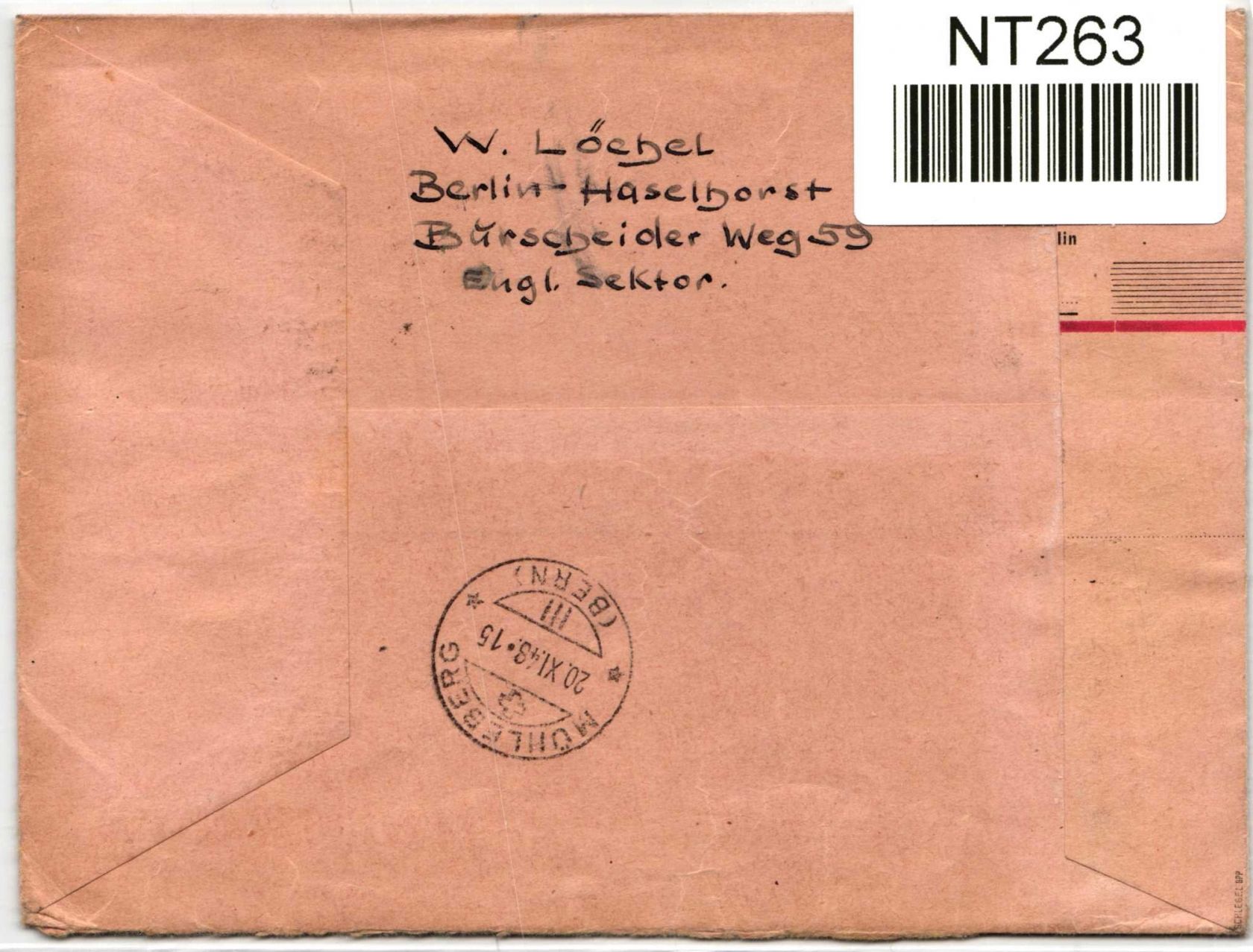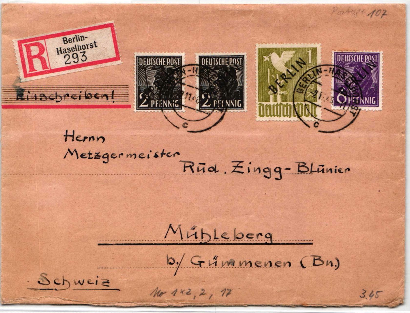 1 DM und 2+6 Pfennig Schwarzaufdruck als Mischfrankatur portogerecht auf Auslandbrief Einschreiben von Berlin am 21.10.1948 nach Mühleberg in die Schweiz gelaufen.