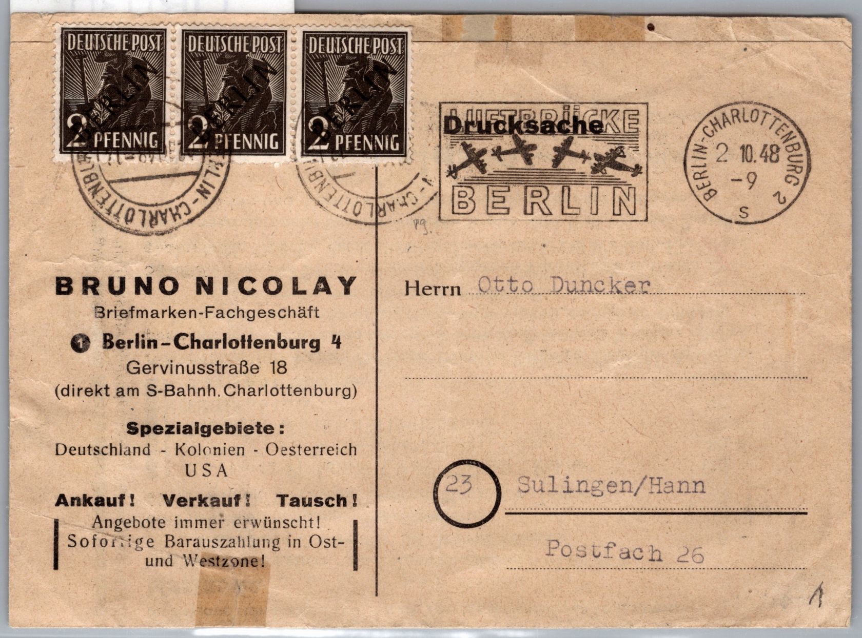 2 Pfennig Schwarzaufdruck per 3 als Mehrfachfrankatur auf Fernbrief Drucksache mit Luftbrückenstempel Berlin Charlottenburg portogerecht am 2.10.1948 nach Sulingen gelaufen.