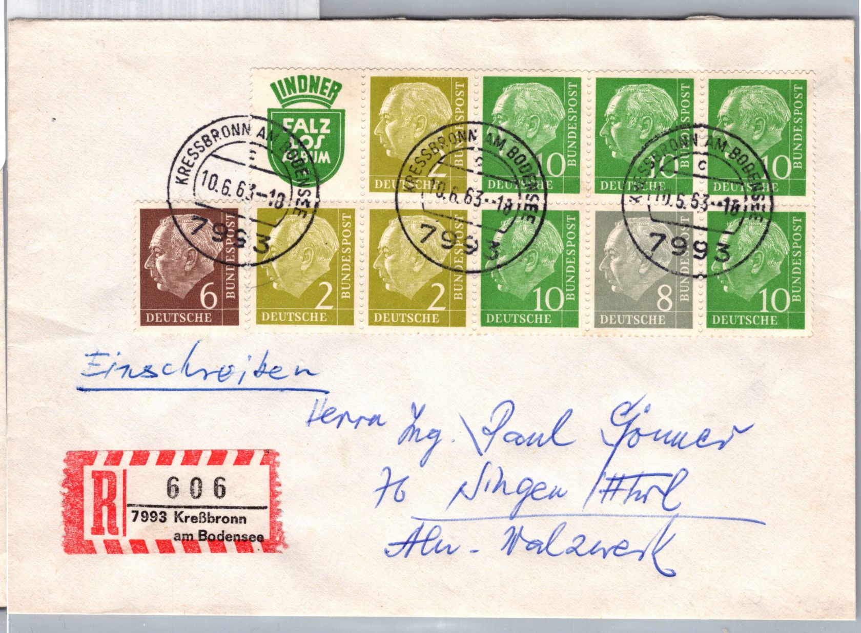Heuss Heftchen-Blatt 7 in Kombination mit 6 Pfennig Heuss als Mischfrankatur auf Fernbrief Einschreiben portogerecht am 10.6.1963 von Kressbronn nach Singen gelaufen.
