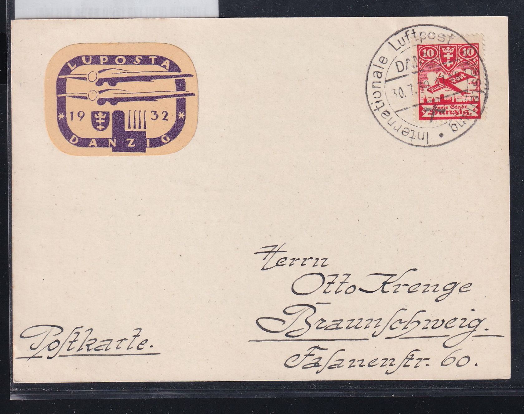10 Pfennig Flugpostmarke auf Postkarte portogerecht am 30.7.1932 mit Sonderstempel Luposta von Danzig nach Braunschweig gelaufen.