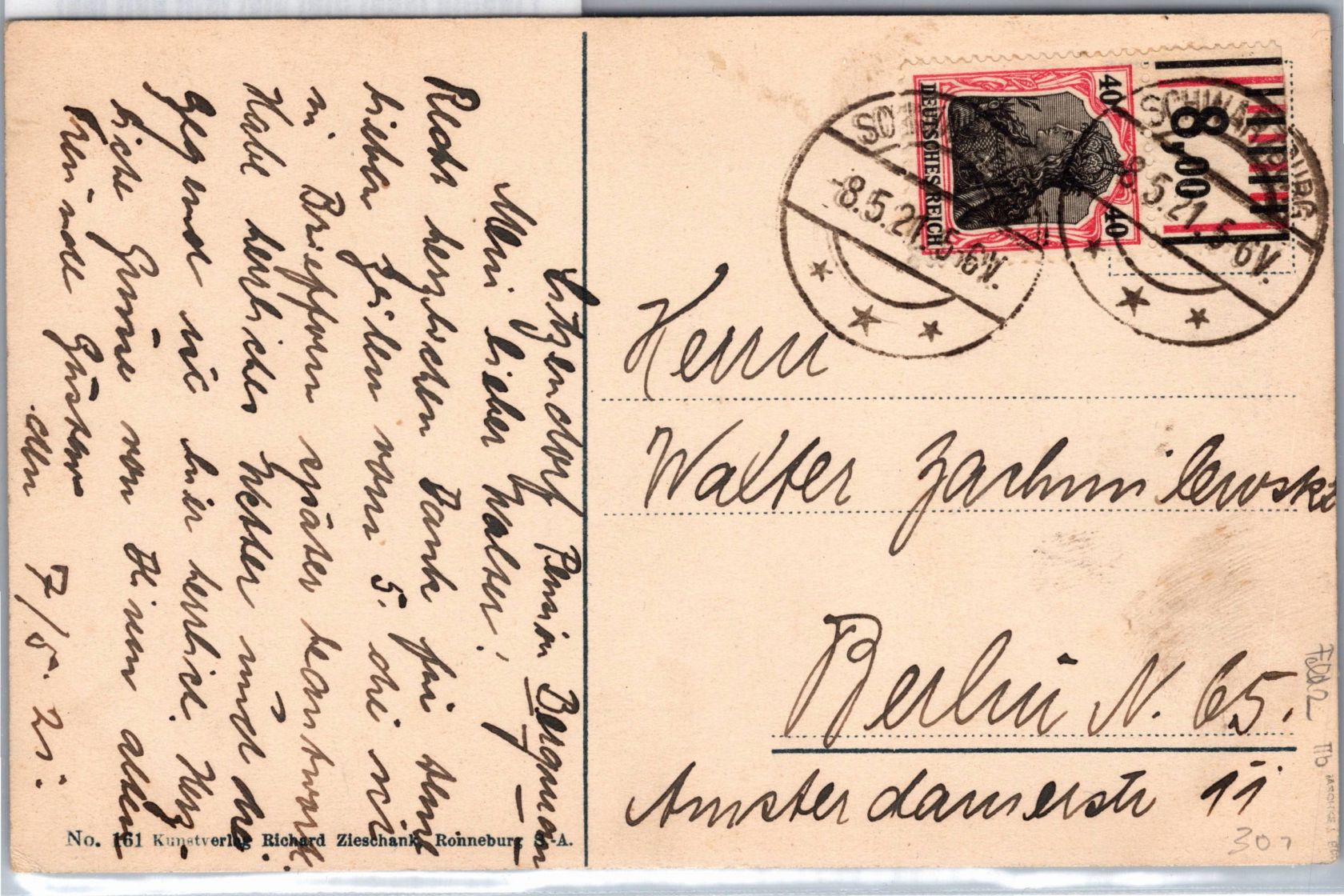40 Pfennig Germania vom Oberrand und Zusatzfrankatur als Mischfrankatur auf Ansichtskarte München Marienplatz am 28.1.1922 in die Schweiz gelaufen.