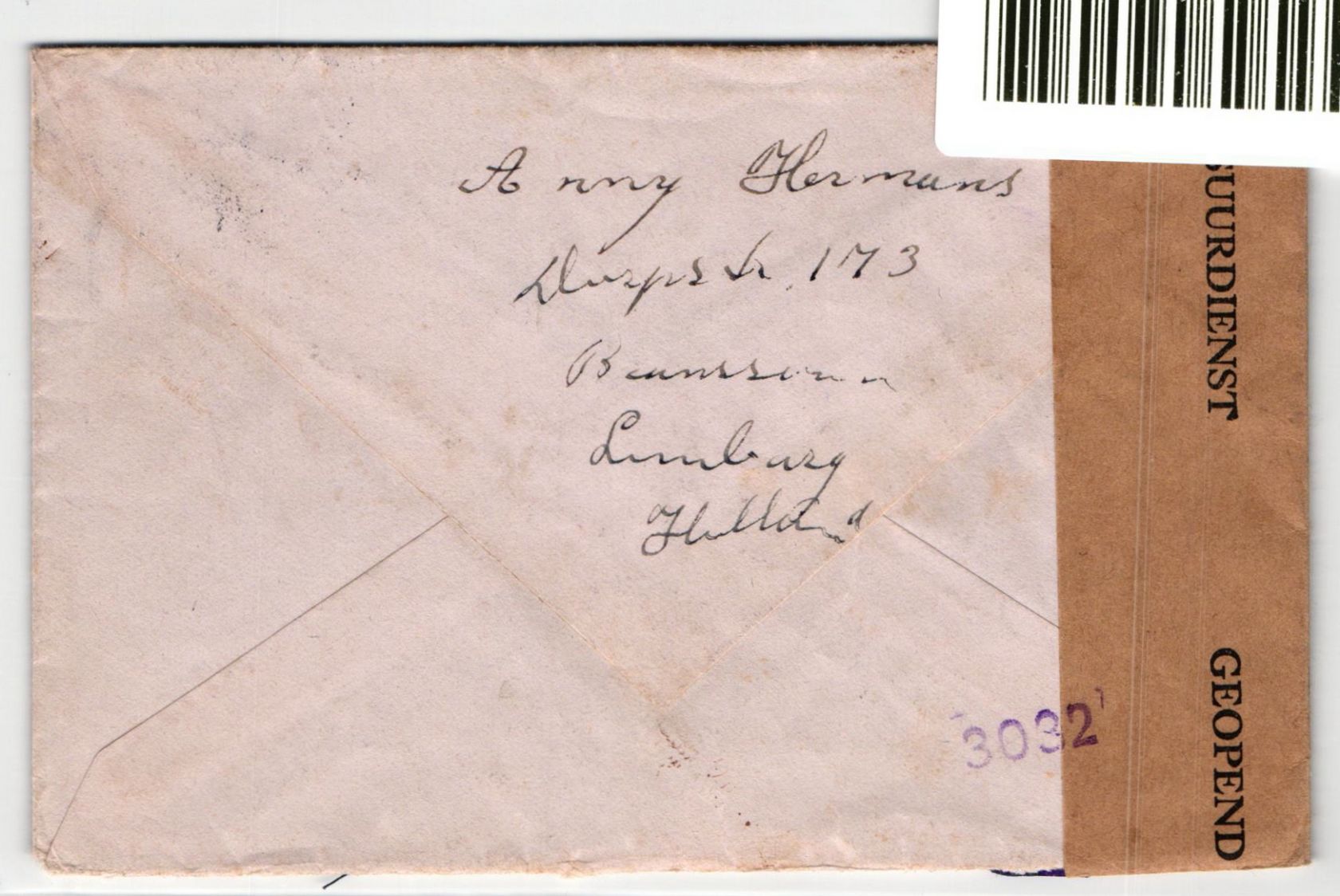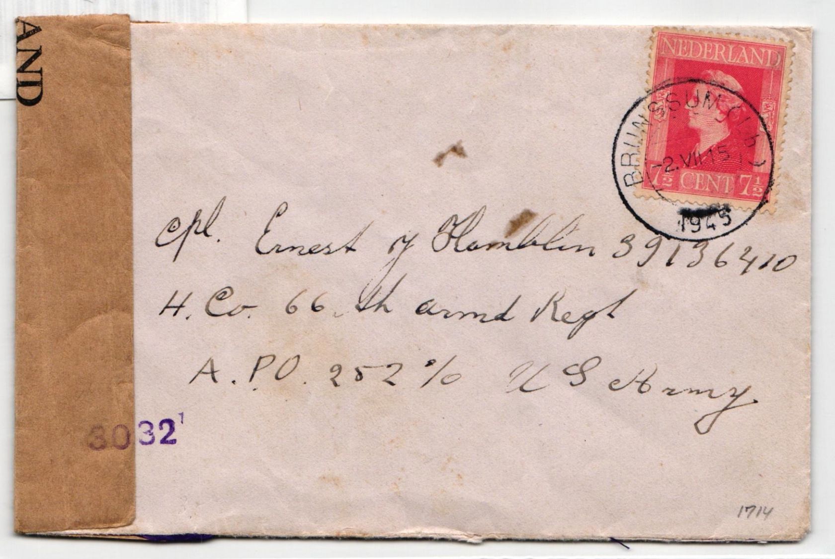 Privat-Brief aus Brunssum (Holland) vom 2.7.45 an einen US Soldaten des 66. Panzerregiments (APO 252). APO 252 war in Berlin ab dem 5.7.45 stationiert.