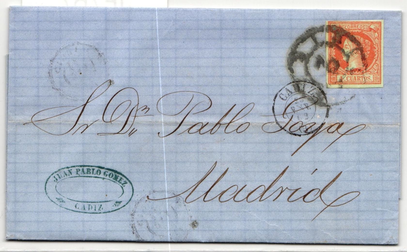 4 Cs. auf Faltbrief von Cadiz nach Madrid gelaufen.