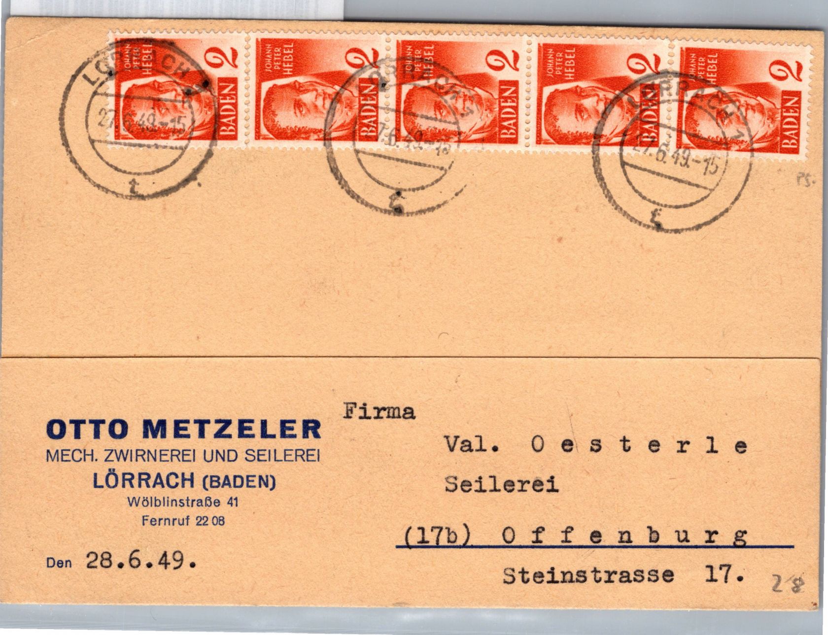 Französische Zone Baden 28 im 4er Streifen auf Postkarte portogerecht #DBO84